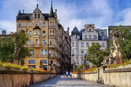 Karlovy Vary, Czech Republic - Jun 01, 2017 - River and Promenade street in Karlovy Vary, spa town situated in western Bohemia, Czech Republic