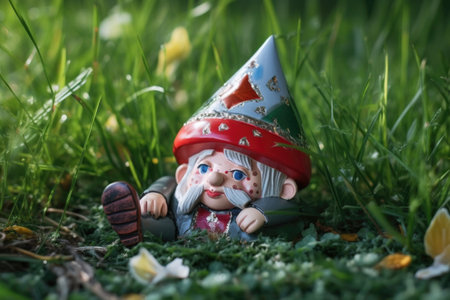 broken gnome lying on grass with shattered hat, created with generative ai