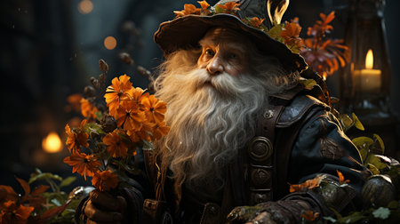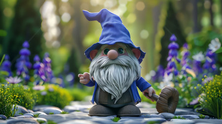 Enchanted Garden Gnome with Pointed Hat and Walking Stick Standing Among Blooming Flowers in Magical Forest AI Generative