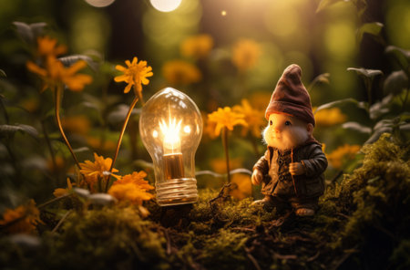 Gnome admiring a light bulb among forest flowers
