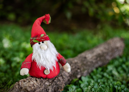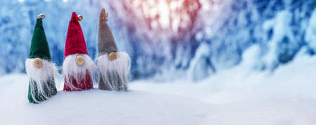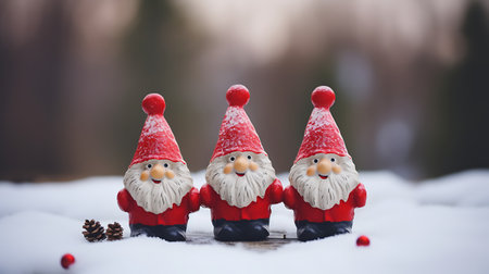 Miniature garden gnomes on nature background. Christmas and New Year concept.