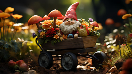 Garden gnome on a wheelbarrow with flowers and apples