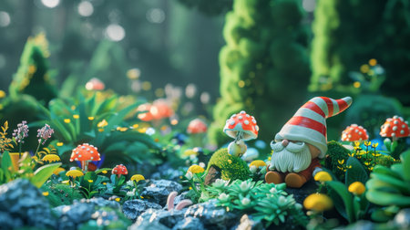 A charming garden gnome sits amongst a vibrant array of mushrooms and lush greenery, evoking the whimsical spirit of an enchanted miniature world.