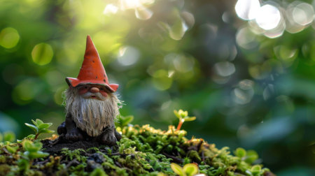 Garden gnome figurine in a sunlit forest setting with lush green moss and soft focus background.