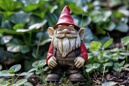 This charming garden gnome, adorned with a vibrant red hat and a white beard, is positioned among lush green foliage. The setting showcases a lively garden atmosphere, perfect for adding character to any outdoor space.