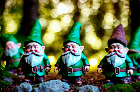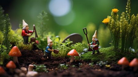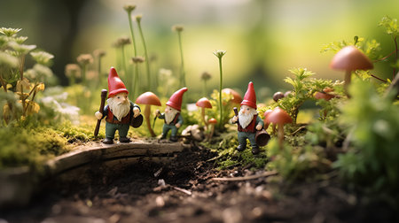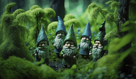 Toy dwarves in forest. Cute figures of garden gnomes in woodland. Generative AI