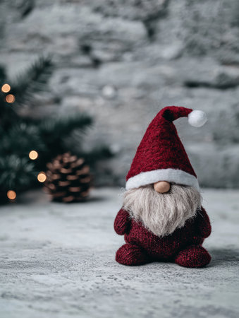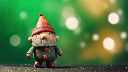 Toy cute Swedish Scandinavian folklore Christmas gnome nisse, tomte, with a big red hat and white beard, in the style of Danish design, with christmas background. copyspace. AI generated.