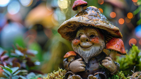 Charming garden gnome wearing a mushroom hat, surrounded by lush greenery and colorful lights in the background, creating a whimsical and magical atmosphere.