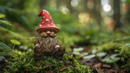 A whimsical gnome figurine with a red mushroom hat, seated on moss in a forest, creating a magical, fairy-tale atmosphere.
