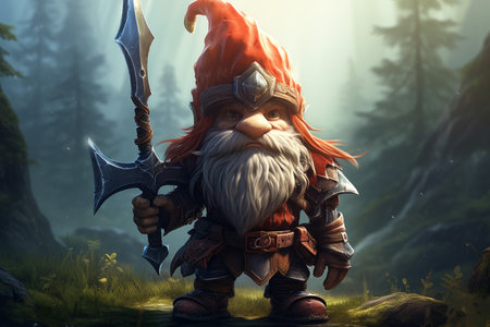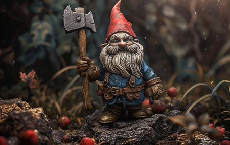 A gnome holding an axe, stands amidst woods, evoking a mystical atmosphere