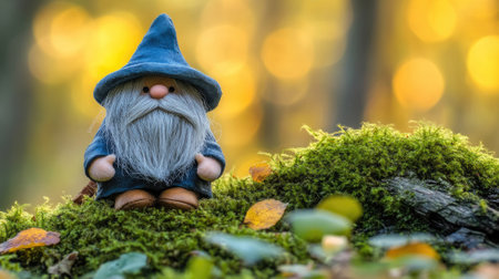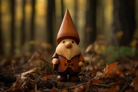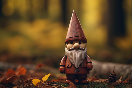 Charming gnome statue stands amidst the fall foliage in a mystical woodland setting