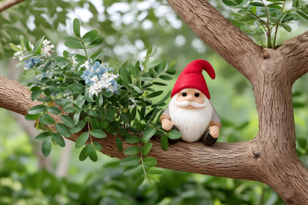 Cute garden gnome with red hat and white beard relaxing on a tree branch surrounded by green leaves and small flowers