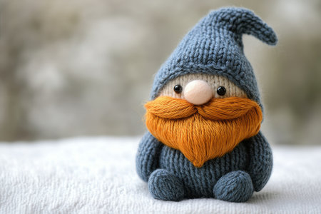 A charming gnome figurine sits on a soft surface, featuring a bright orange beard and a cozy blue knitted hat, showcasing intricate craftsmanship and warm colors.