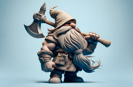 a cartoon character of a dwarf with a long beard and a pointed hat, wielding an axe