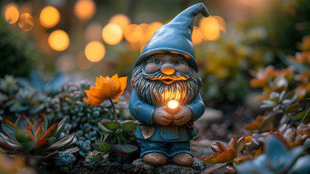 A garden gnome waves hello in a lush garden setting, lit by candles and a nearby lantern