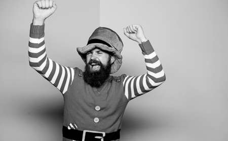 get lucky. st patricks day. happy bearded hipster in green hat. christmas elf. happy celebration. man with beard have fun. ireland beer tradition. Winter carnival. irish pub party. mature leprechaun