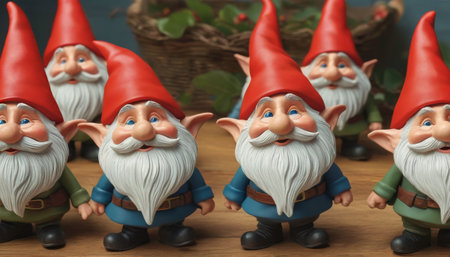 Three whimsical gnomes stand side-by-side, each with a unique hat and outfit. The figures showcase a variety of textures and colors, set against a blurred background. This image could be suitable for decorative projects, illustrations, or content related to fantasy and garden themes.