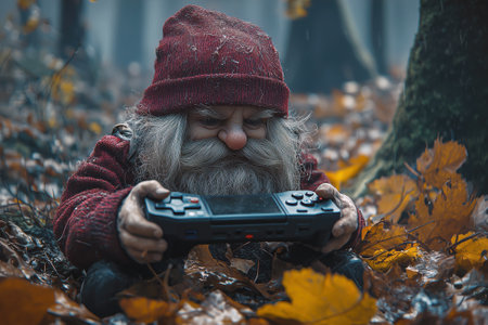 A small gnome-like with a white beard, is sitting on the forest floor covered with autumn leaves, holding a handheld gaming console. The scene is set in a misty forest, creating a mysterious and whimsical atmosphere.