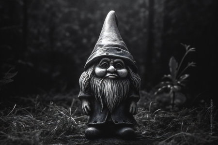 Garden gnome in the forest. Black and white photo.