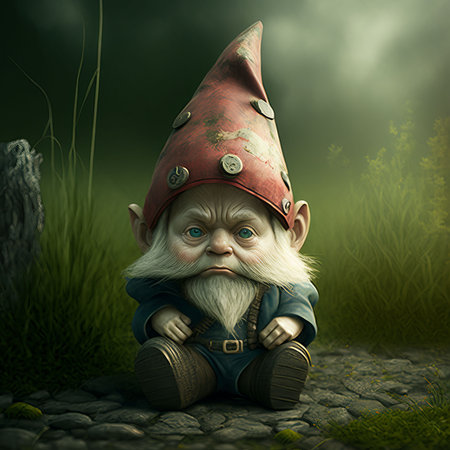 An AI generated illustration of a small gnome sitting on a rocky ground in a grassy outdoor setting