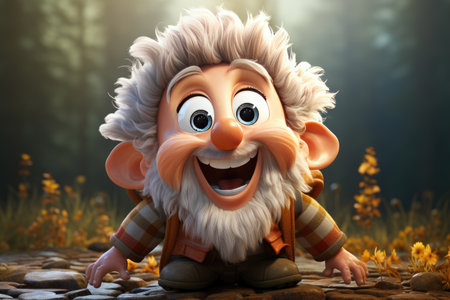 ai midday illustration of a small cute garden gnome in a green garden landscape