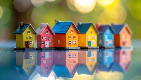A collection of miniature houses in a variety of bright colors are arranged in a row, with reflections on a surface and bokeh.