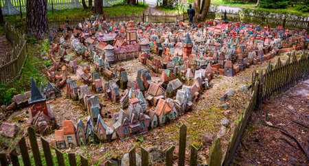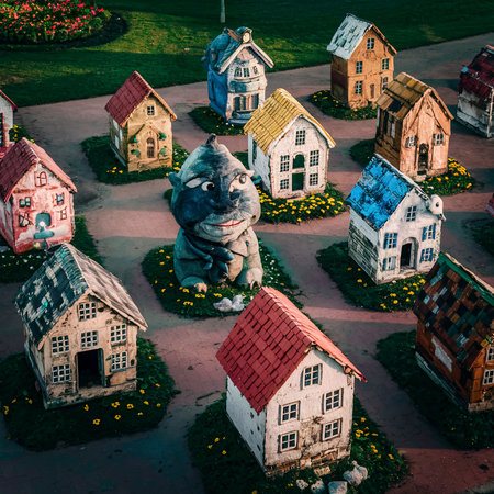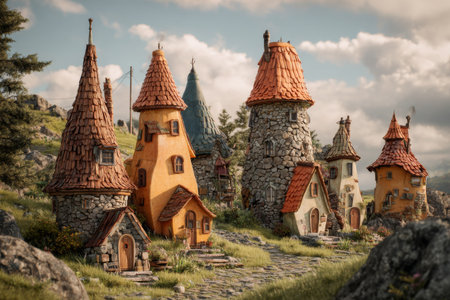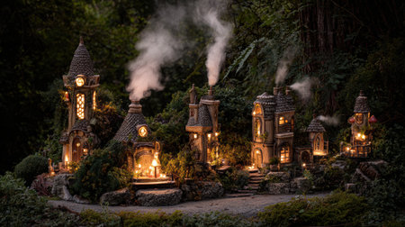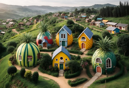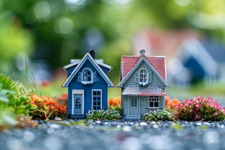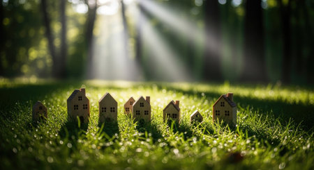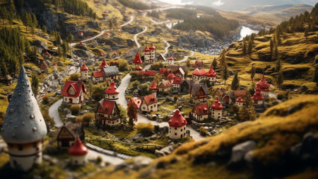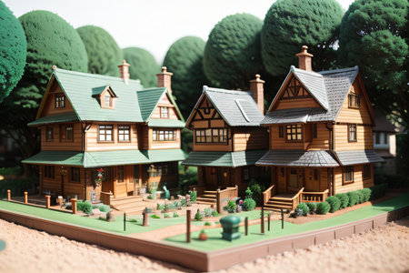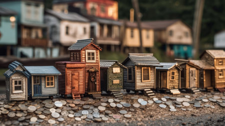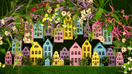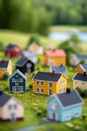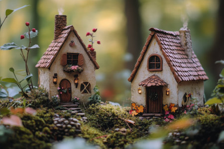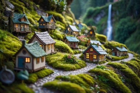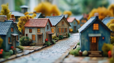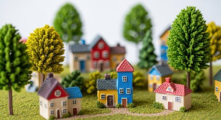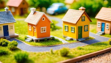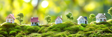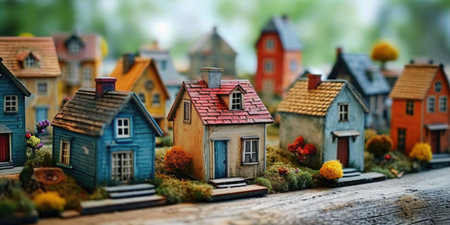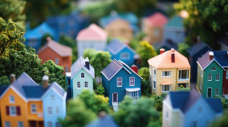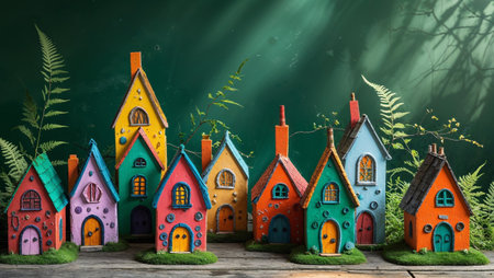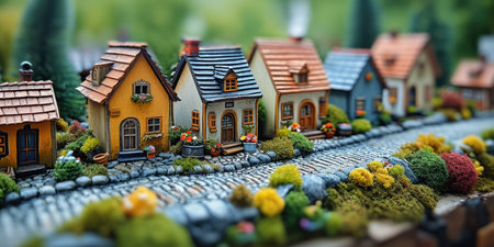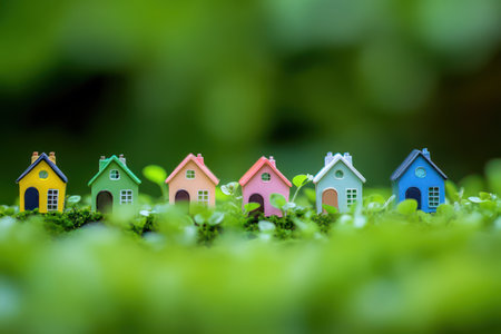 This captivating image showcases a vibrant collection of miniature houses nestled among lush greenery, creating a picturesque neighborhood scene. Perfect for showcasing charm and whimsy.