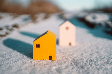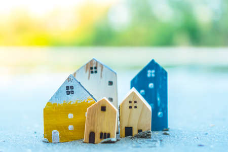 Several toy houses on the ground in the sun. The concept of real estate, living outside the city, rent, mortgage.