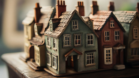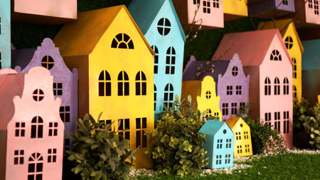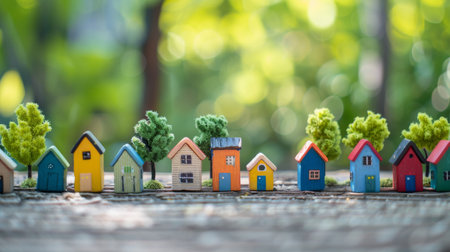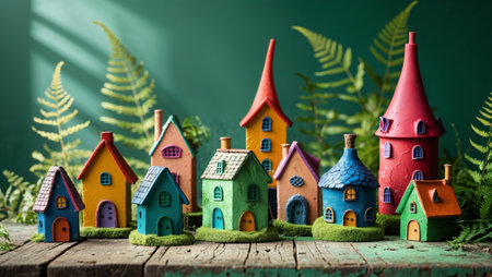 AI Generated. Colorful miniature houses arranged on a wooden table with greenery in the background