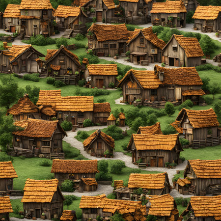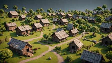 A small village nestled among the hills, with simple wooden houses and lush green foliage
