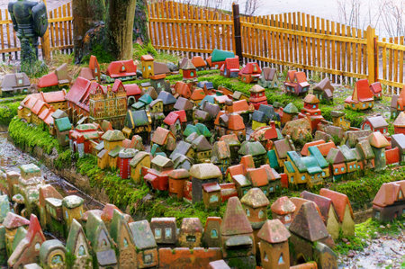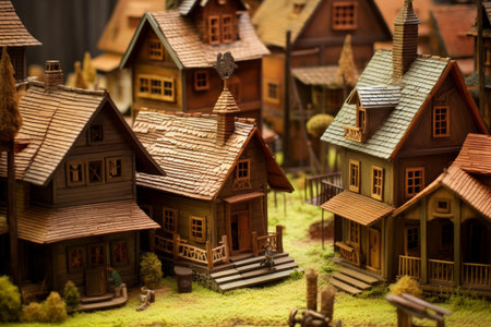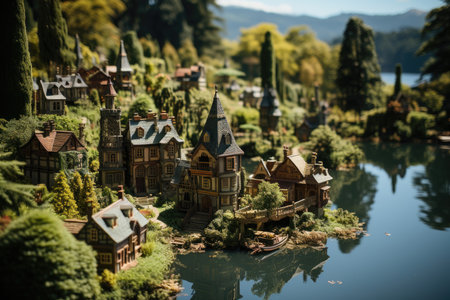 Intricate model village featuring handcrafted wooden houses and realistic landscaping on a small scale