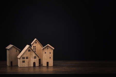 Wooden miniature houses with glowing lights on a wooden table, cozy home decor concept