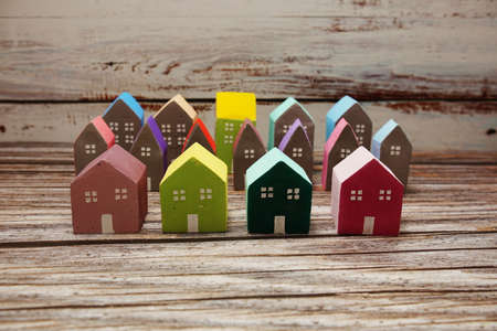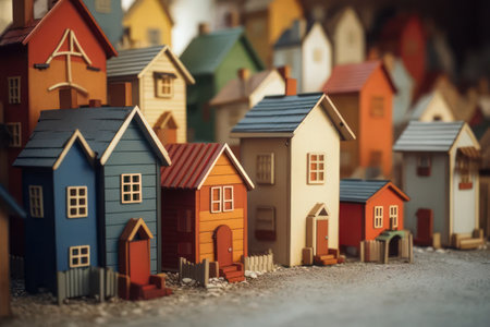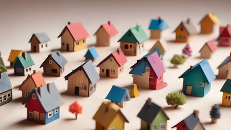 Group of colorful buildings small house model, community care, neighborhood, housing equity and inclusive community concept. Generative ai.