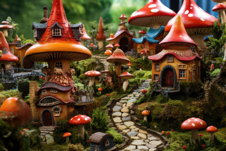 Mushroom garden with fairy tale houses and mushrooms. Selective focus, A delightfully eccentric gnome village set in a mushroom field, AI Generated