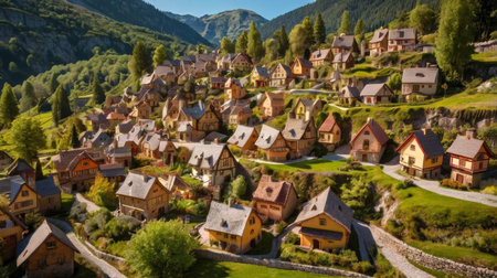 A high-angle, wide-shot captures a quaint village nestled on a hillside, with picturesque homes featuring various roof colors and designs. Cobblestone paths wind through lush green grass and trees, with majestic mountains visible in the background under a clear sky.