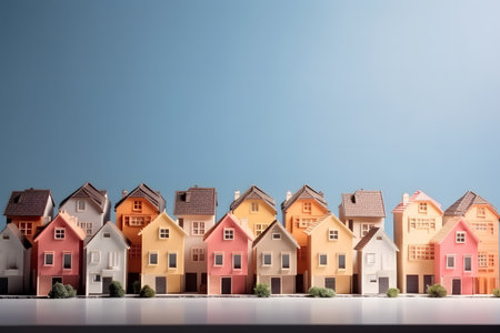 A row of charming, illuminated model homes stands in a perfect line against a vibrant green background. Each house, with its warm lights glowing from within, represents a unique dream of homeownership, community, and suburban tranquility. This idealized neighborhood symbolizes real estate investment, property development, and the concept of finding the perfect place to call home.