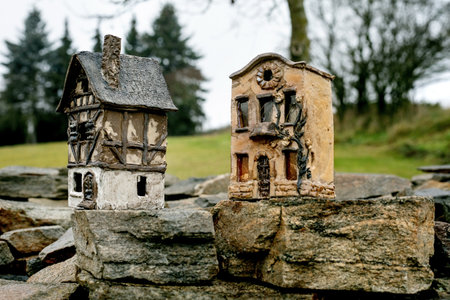 New trends in garden and interior decoration: ceramic houses with glowing windows in modern style. Garden ceramics, miniature. The house placed on old stone wall against rural landscape. Cloudy day.
