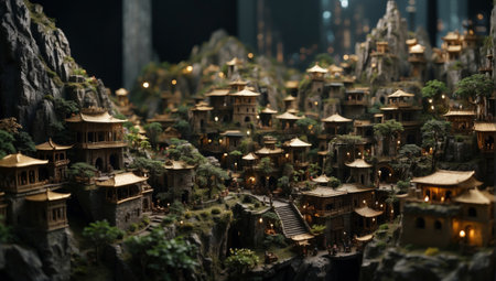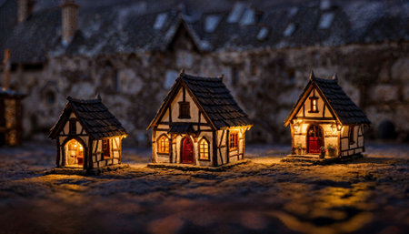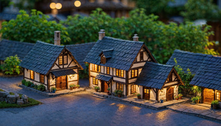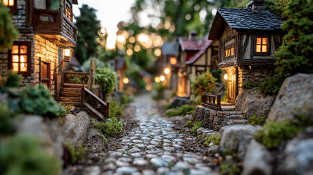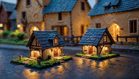 Small houses glow warmly in a miniature village layout amidst natural scenery at dusk.