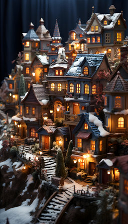Charming winter village with twinkling lights and joyful Christmas celebration.