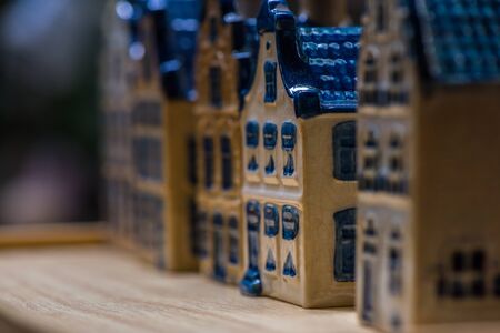 White and blue ceramic souvenir miniature of houses on wood background, Sensitive Focus