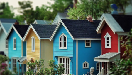 Vibrant Row of Colorful Houses with Black Roofs on Tree-Lined Streets in a Charming Neighborhood