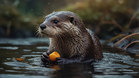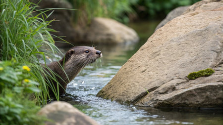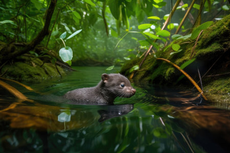 otter pup swimming in crystal-clear stream, surrounded by lush greenery, created with generative ai