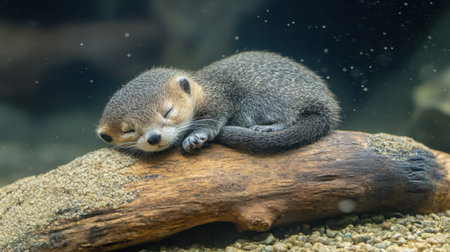 This image showcases a young mammal peacefully asleep on a log underwater, surrounded by soft sand and gentle bubbles, capturing the essence of tranquility in wildlife.