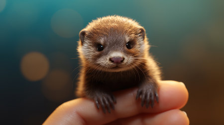 a cute and tiny otter is sitting on top of a person's finger in this photorealistic painting by aleksander gierymski. the intricate and highly detailed 8k artwork showcases the adorable creature in a close-up portrait. rendered in keyshot, this epic concept art captures the cutest essence of the young otter. ai generated