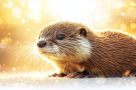 The river otter gazes curiously, showcasing its playful spirit against a soft, warm backdrop of light.