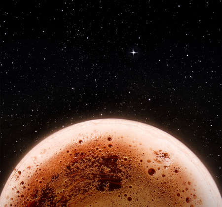 A breathtaking view captures a red planet softly lit by a nearby bright star. The scene presents a cosmic dance of celestial bodies against the dark backdrop of space.