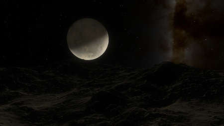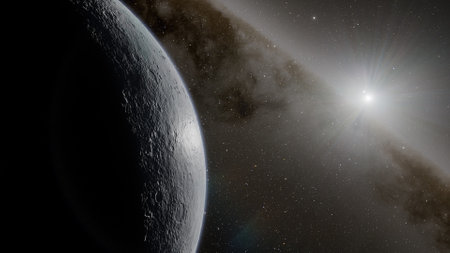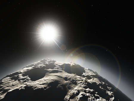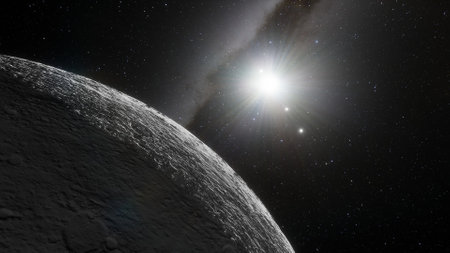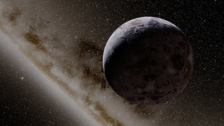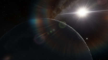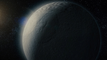 fictional Eris sun rise in dark background with stars. front view of eris planet from space. full 3d view of eris 4k resolution.