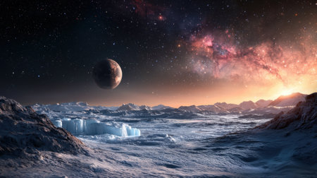 A desolate landscape with a large planet in the background and a bright orange sun in the foreground. The scene is peaceful and serene, with the bright sun casting a warm glow over the icy landscape