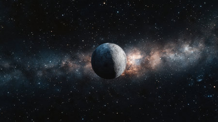 Distant planet in space surrounded by asteroids and stars amidst cosmic dust and darkness.
