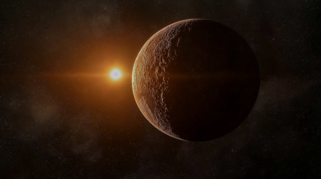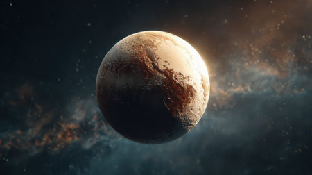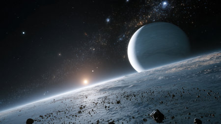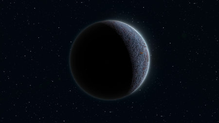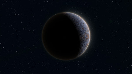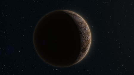 Stunning depiction of a planetary surface illuminated by sunlight at the horizon, set against a deep dark space background. This artwork captures the essence of cosmic beauty and mystery.